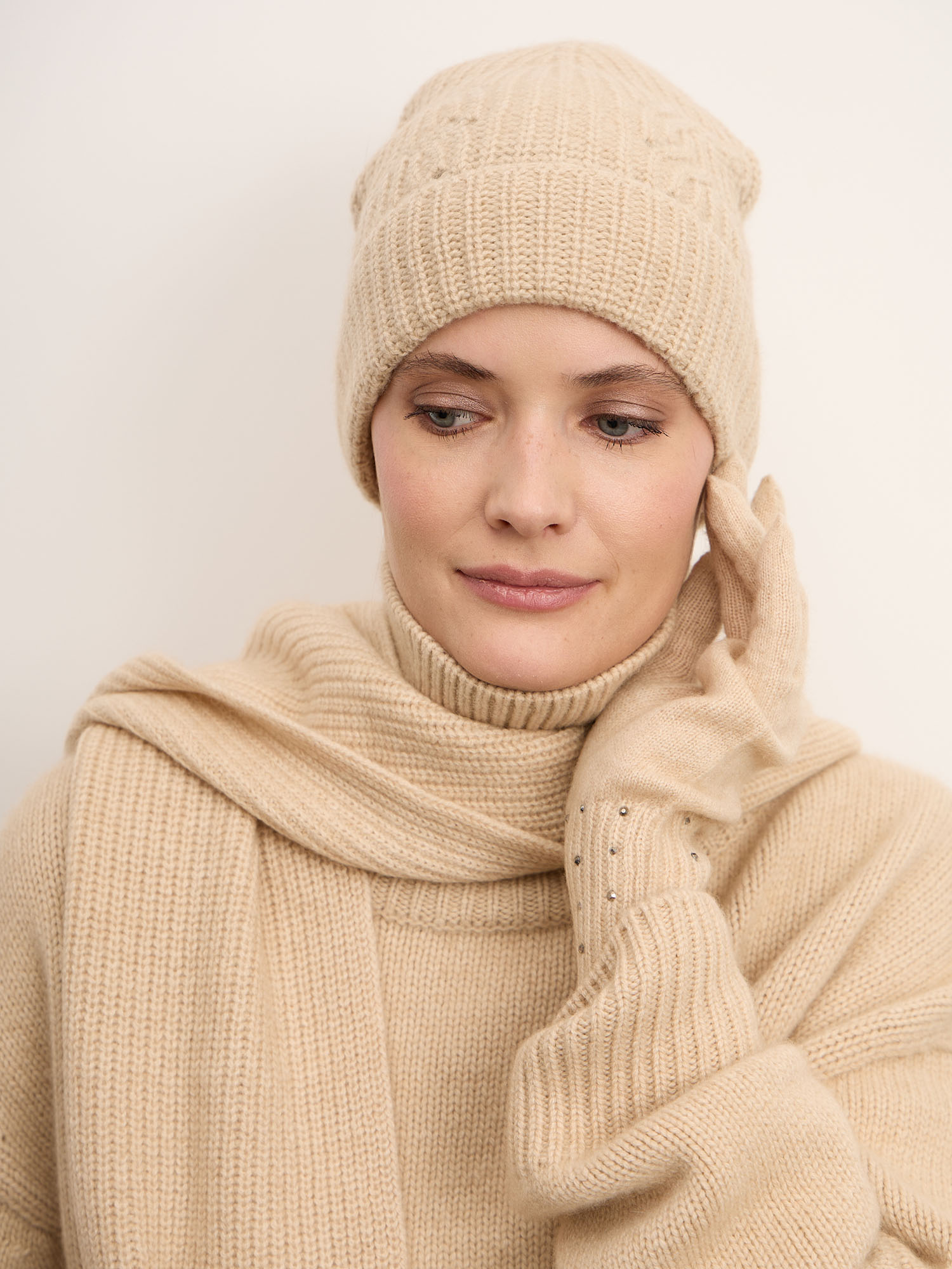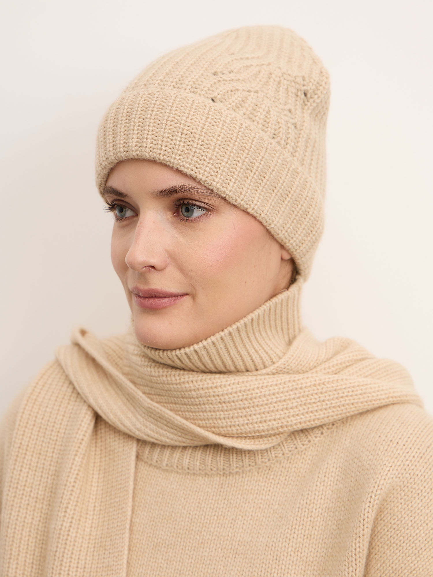 Бежевая кашемировая шапка — универсальный аксессуар в стиле спокойной элегантности. Лаконичная форма и благородная фактура натурального кашемира делают модель базовой частью зимнего гардероба. Мягкая, легкая и пластичная, она деликатно согревает, создавая ощущение уюта без утяжеления образа. Идеально сочетается с пальто, пуховиками и трикотажными комплектами в нейтральной гамме.