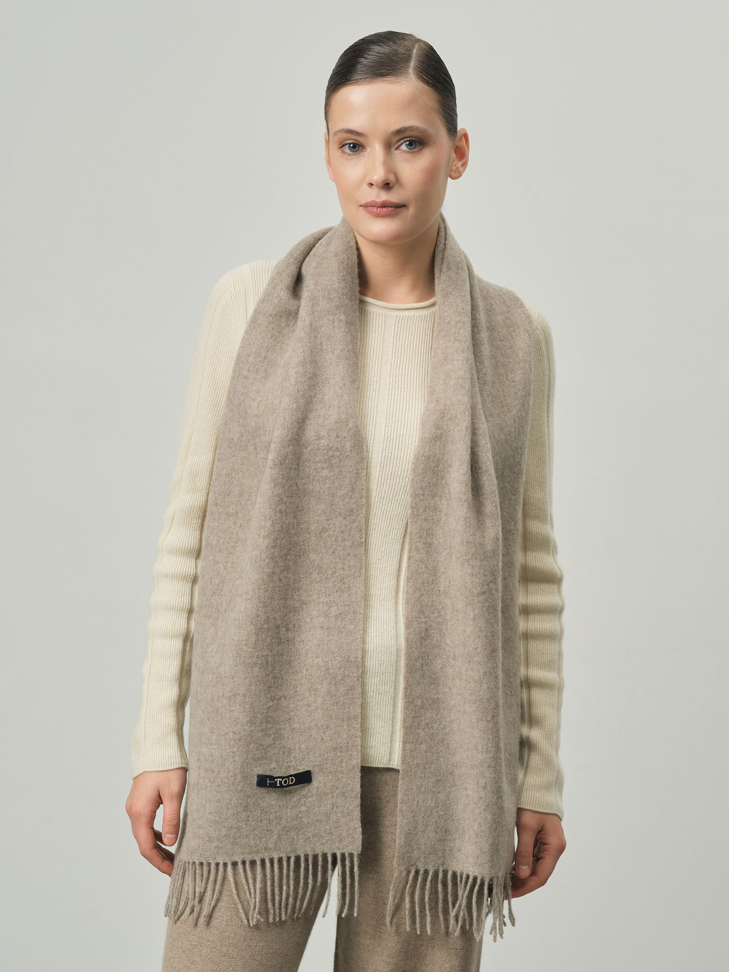 Классическая прямоугольная форма с лаконичной текстурой. Края украшены аккуратной бахромой, которая добавляет аксессуару лёгкость и завершённый вид.