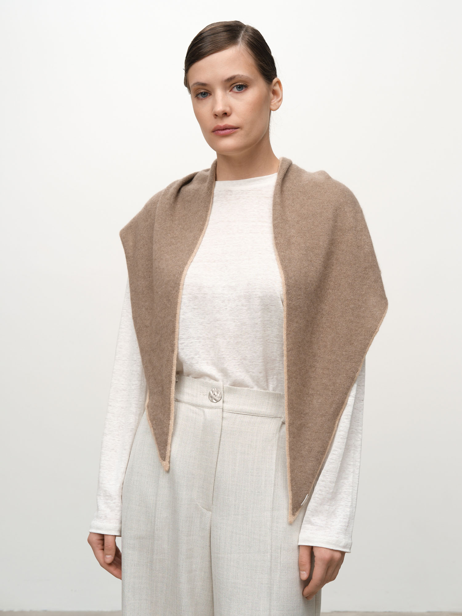Модель выполнена в аккуратной треугольной форме, которая позволяет красиво драпировать аксессуар на плечах или вокруг шеи. Минималистичный дизайн подчёркивает благородную фактуру кашемира.