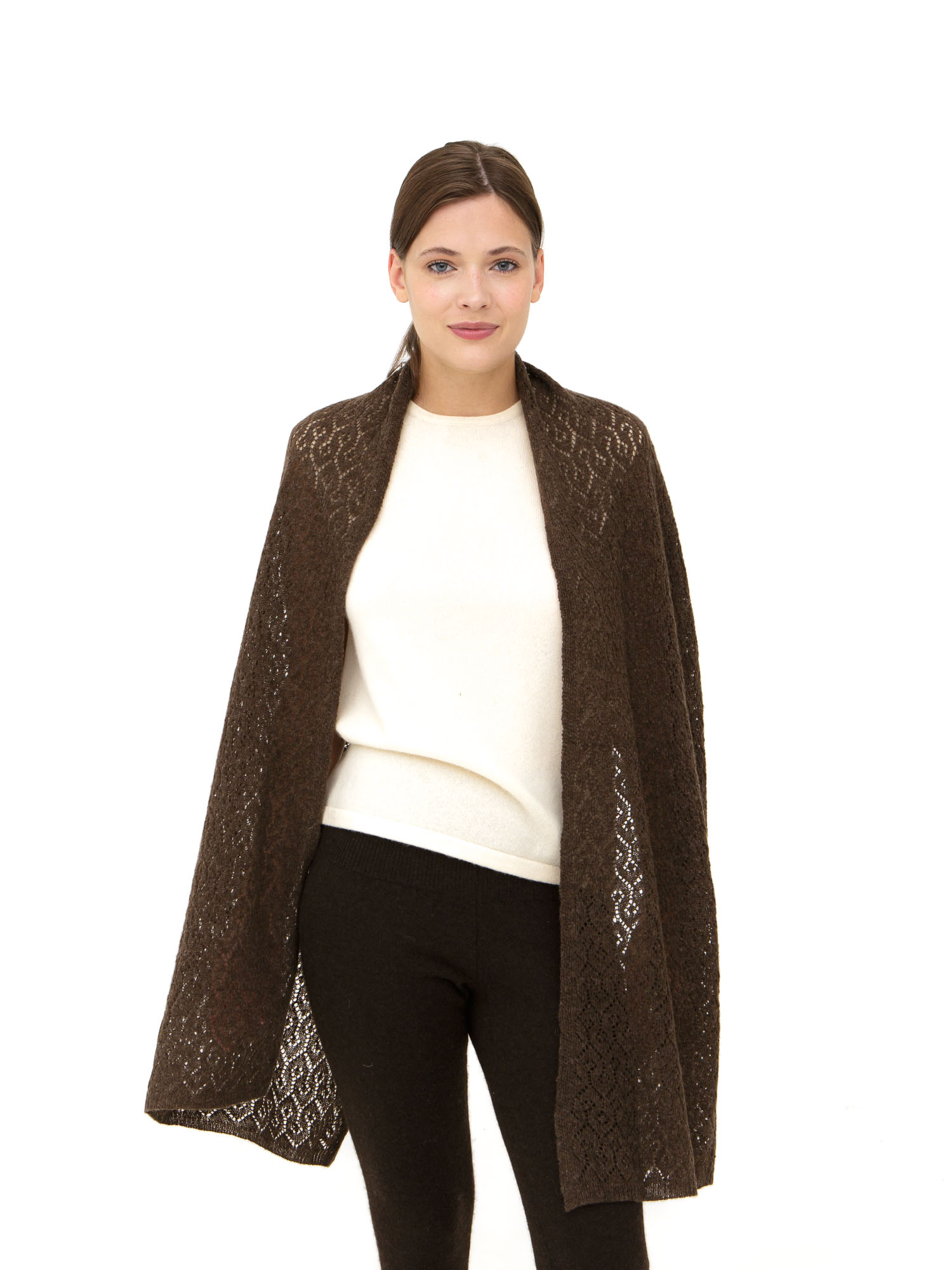 Палантин выполнен в классической прямоугольной форме с лёгкой ажурной вязкой, которая придаёт изделию изящную текстуру и визуальную лёгкость. Минималистичный дизайн без лишних элементов подчеркивает натуральность материала и позволяет легко сочетать аксессуар с различными стилями одежды.