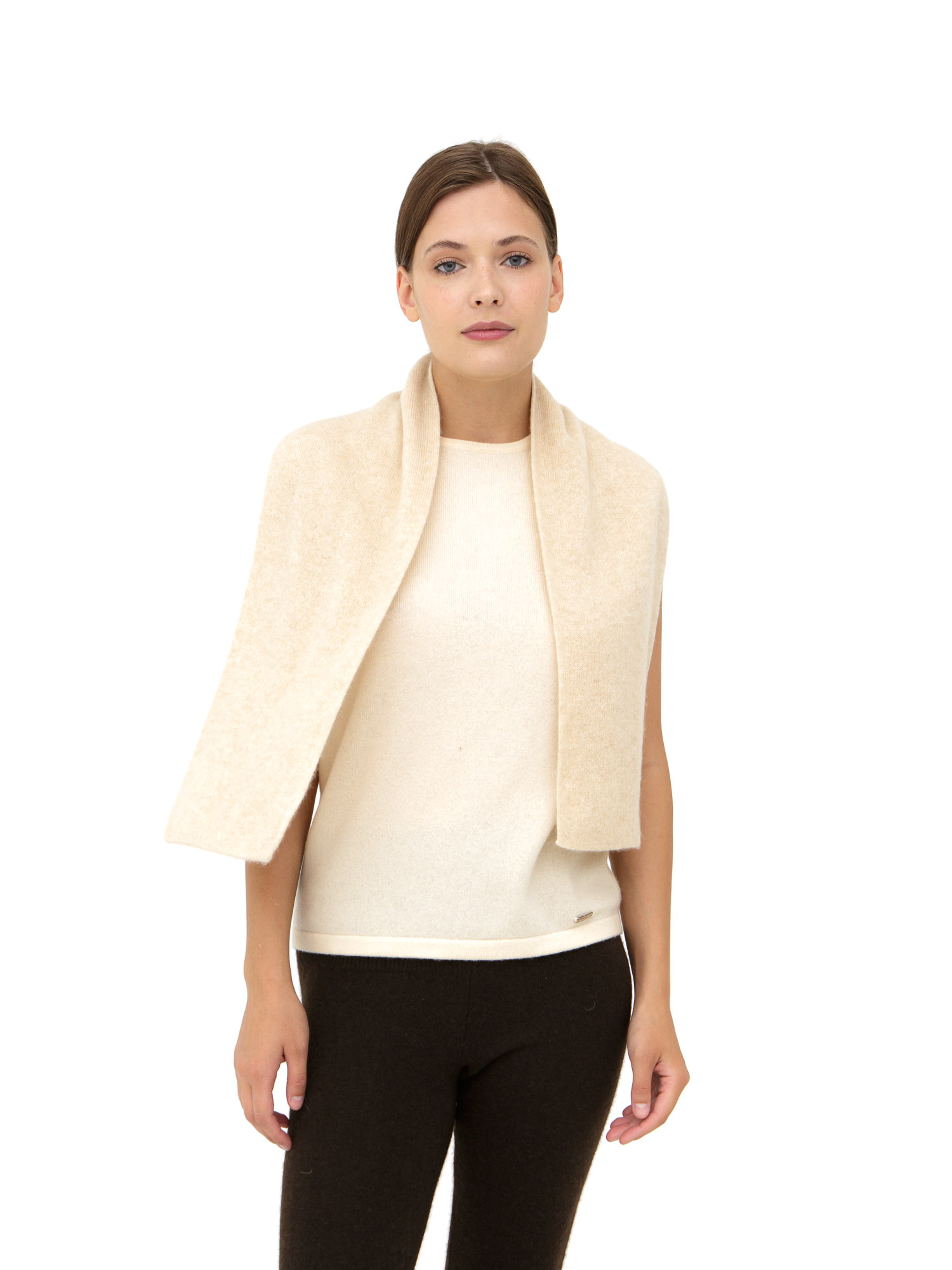 Модель выполнена в классической прямоугольной форме с аккуратной фактурной вязкой. Минималистичный дизайн подчёркивает натуральную текстуру кашемира и делает аксессуар универсальным для различных образов.