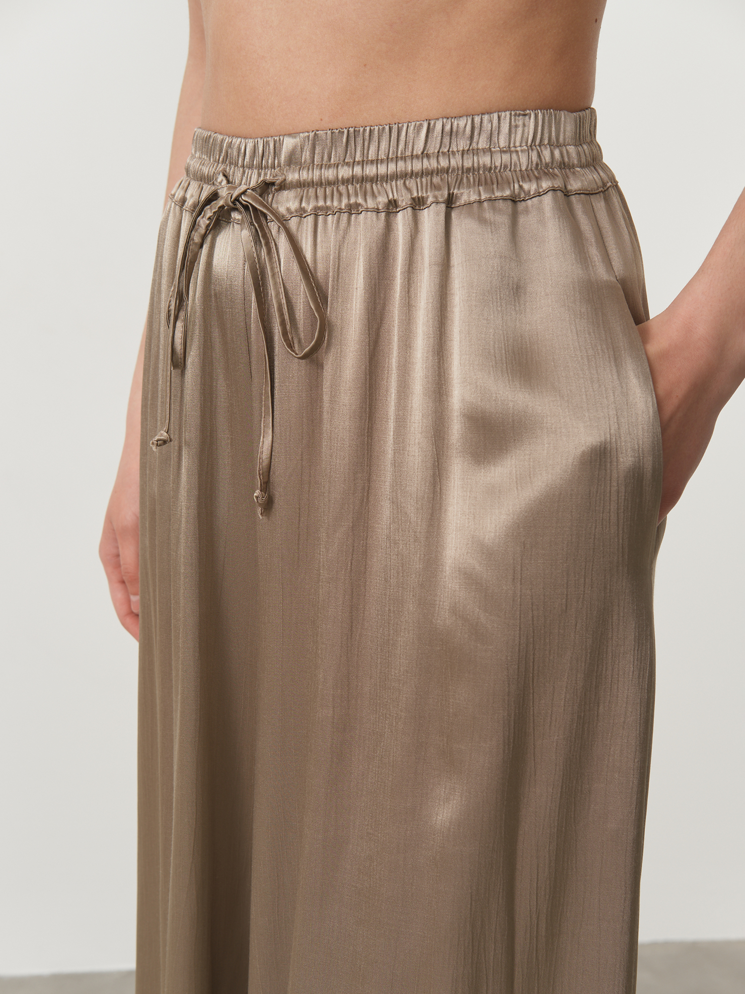 Эластичный пояс с кулиской для регулировки посадки, боковые карманы, мягкая струящаяся ткань, аккуратная обработка швов.