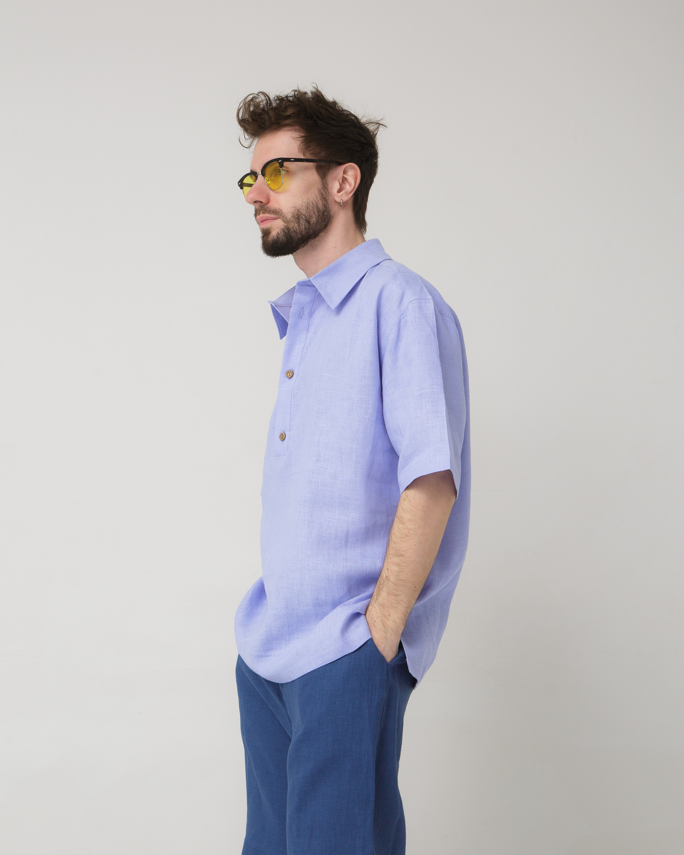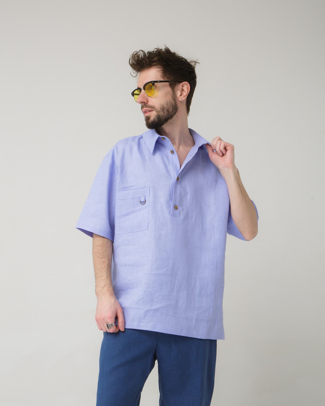 Мужская льняная рубашка-поло в лавандовом оттенке — стильная и современная модель для летнего гардероба. Легкая ткань и свободный силуэт обеспечивают комфорт даже в жаркую погоду, а мягкий цвет придает образу свежесть и легкость. Идеальный вариант для повседневных и расслабленных образов.