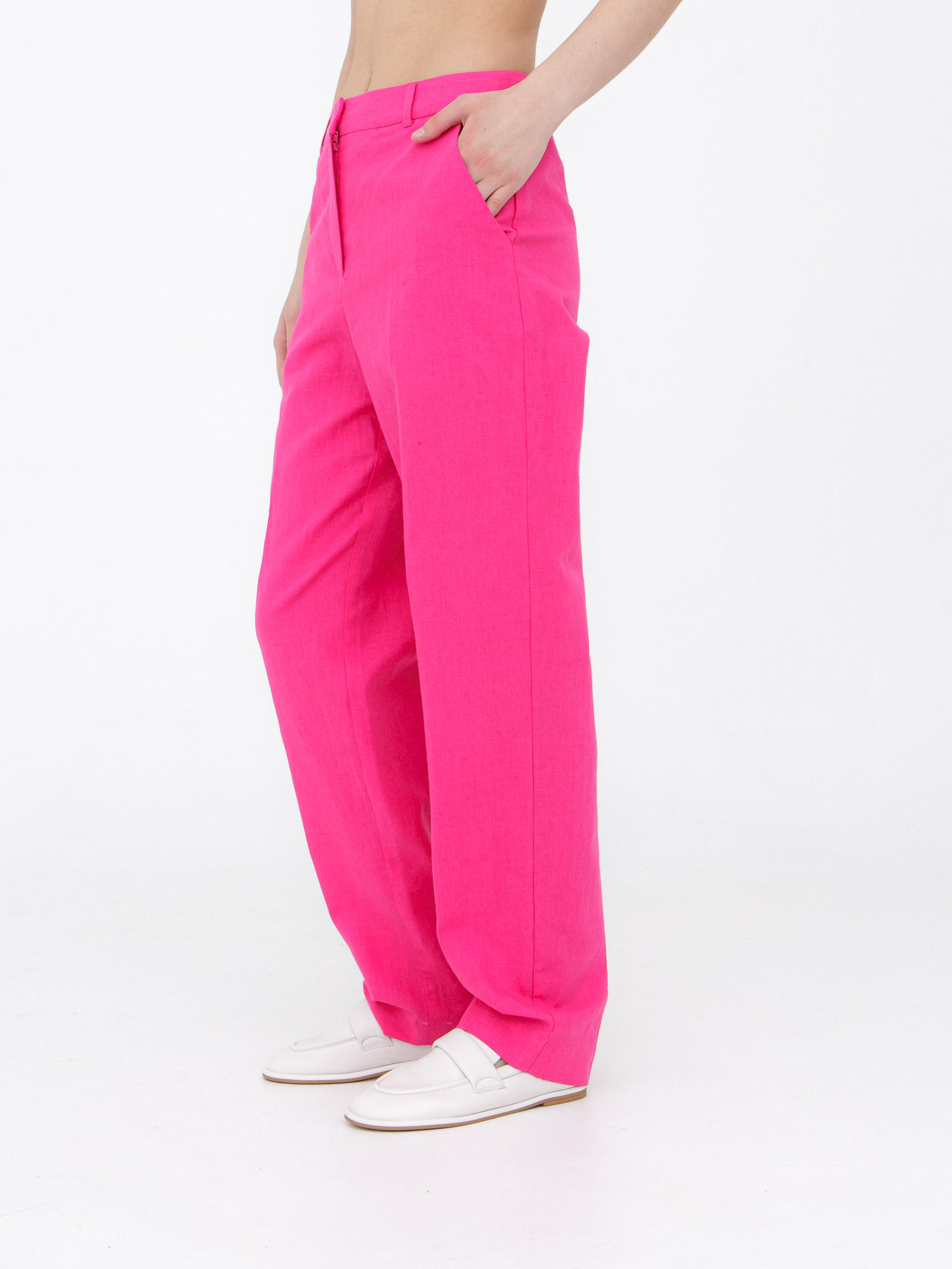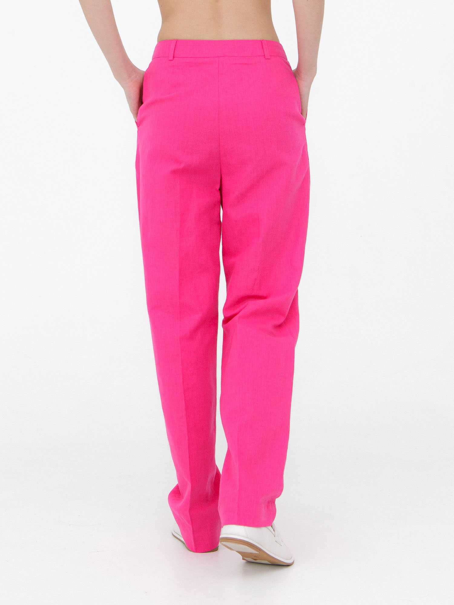 Женские брюки из льна и хлопка в оттенке фуксия — яркая и стильная модель для летнего гардероба. Эффектный цвет в сочетании с лаконичным кроем создает выразительный образ, который подходит как для повседневной носки, так и для более собранных аутфитов. Легкая ткань обеспечивает комфорт в течение всего дня.