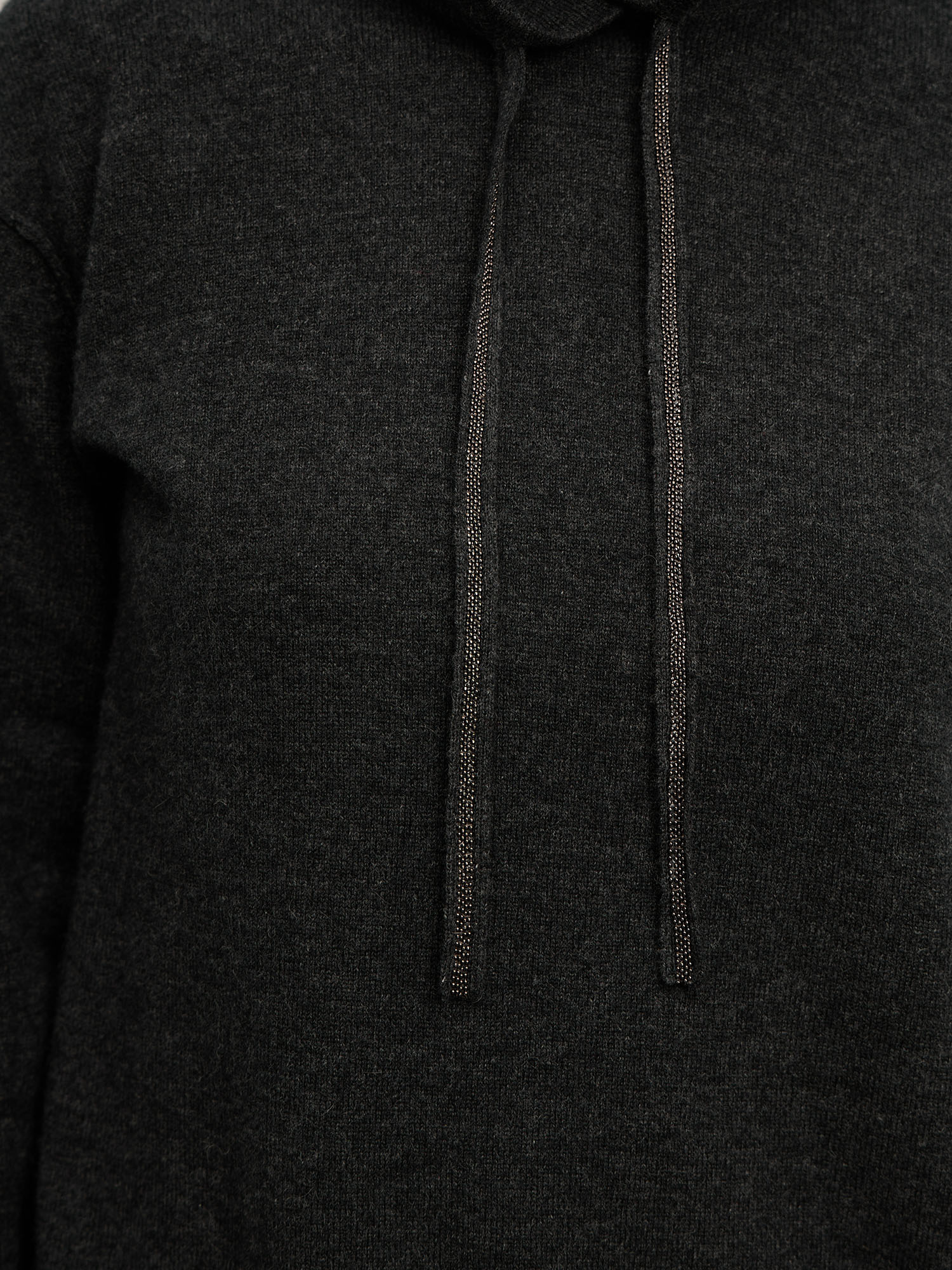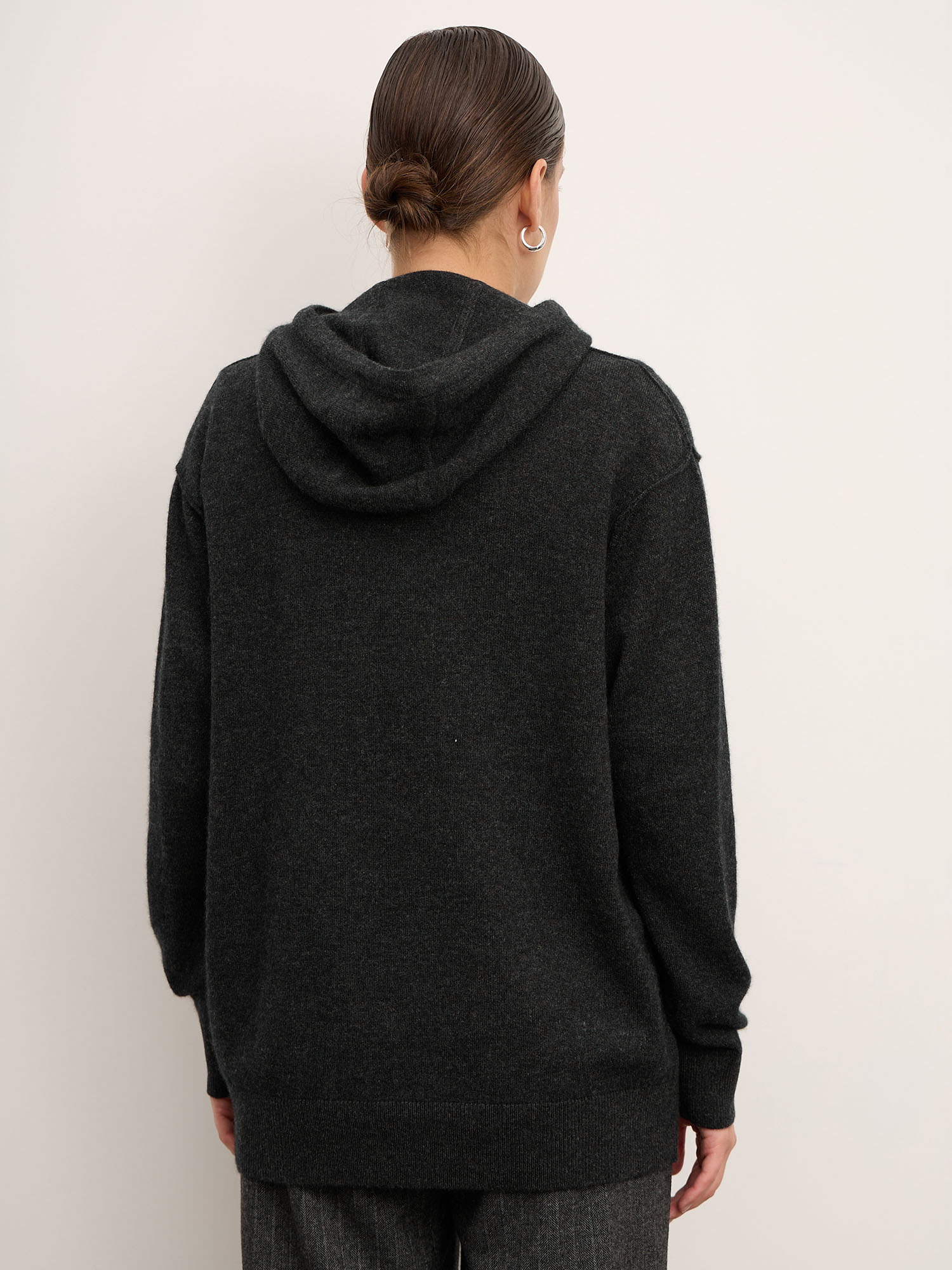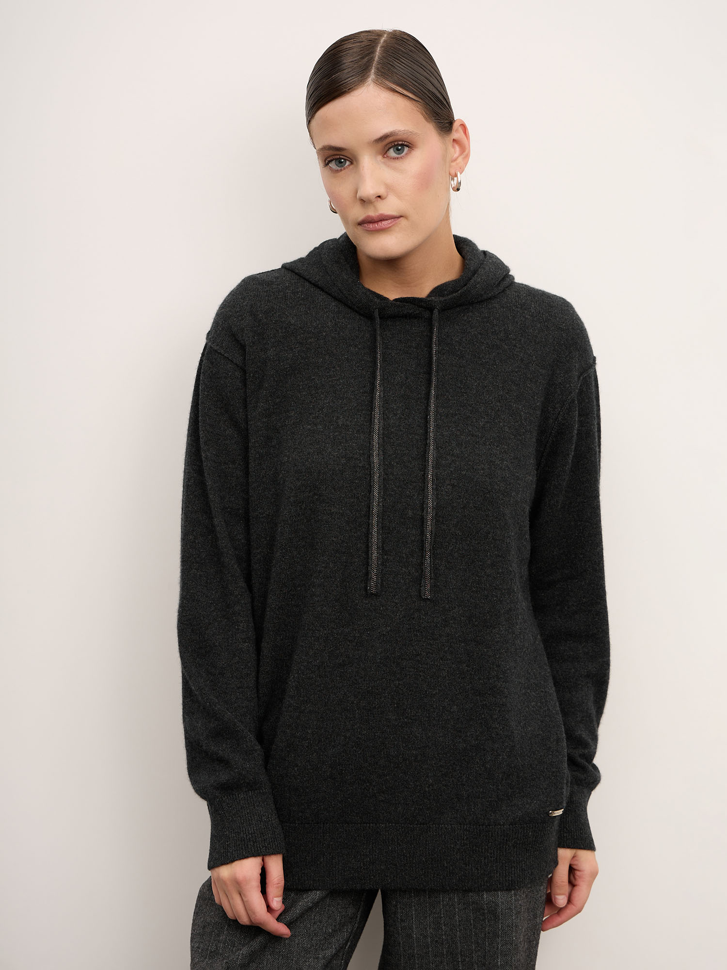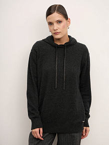 Модель выполнена с капюшоном и регулируемыми завязками, что придаёт изделию современный и расслабленный характер. Гладкая вязка подчеркивает благородную текстуру кашемира. Манжеты и низ изделия оформлены эластичной вязкой для аккуратной посадки и сохранения формы.
